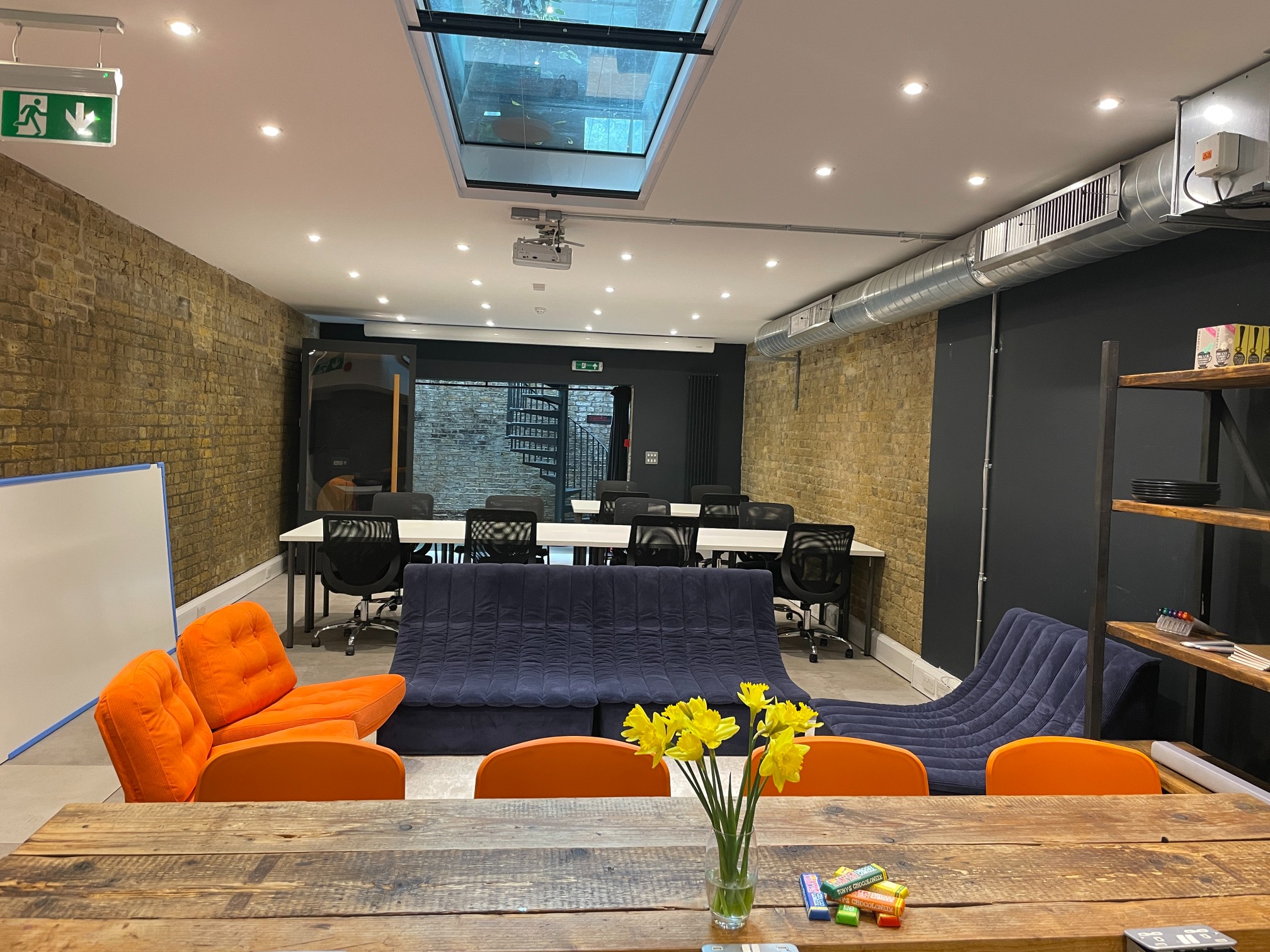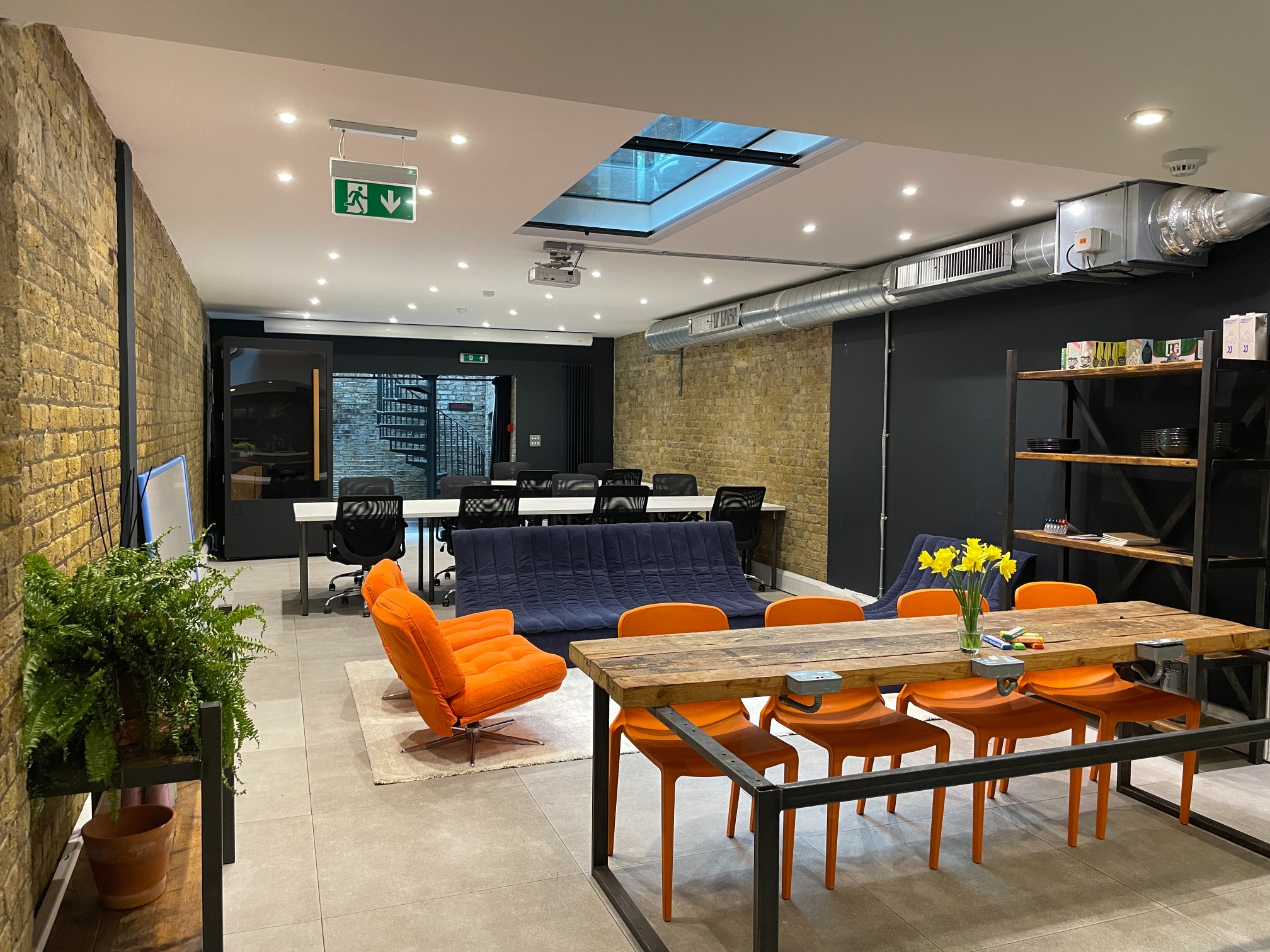 Our self-contained 2-floor penthouse office with roof terrace, two private meeting rooms (10 & 4p), phone booth, seperate 10 person / exec office on upper floor. Dual aspect windows, private kitchen & break-out space.
