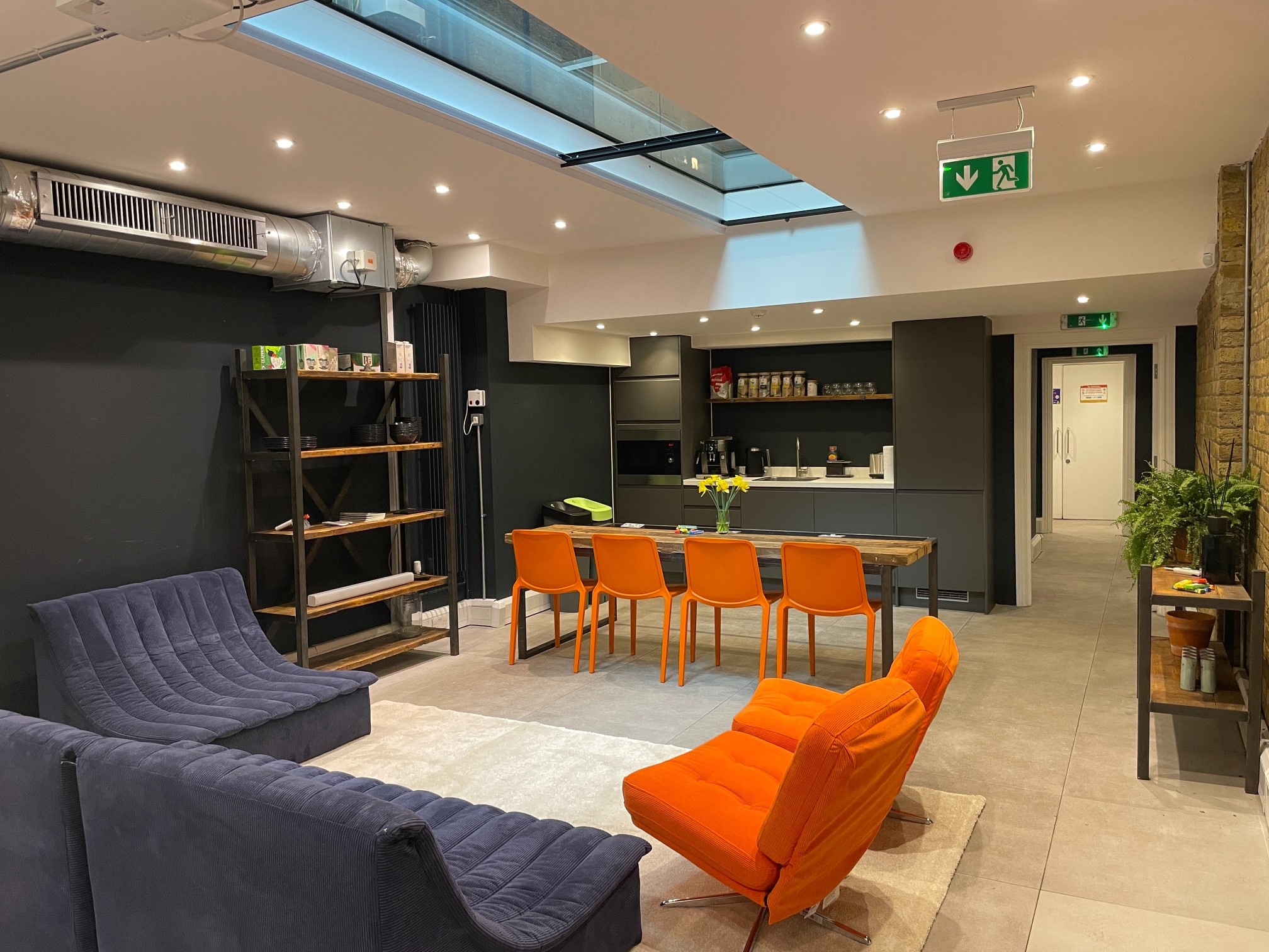 Book A TourA private office for 6, right by a break-out space, with dual-aspect windows and a full-length skylight (image of a similar sized office; this office has more windows).