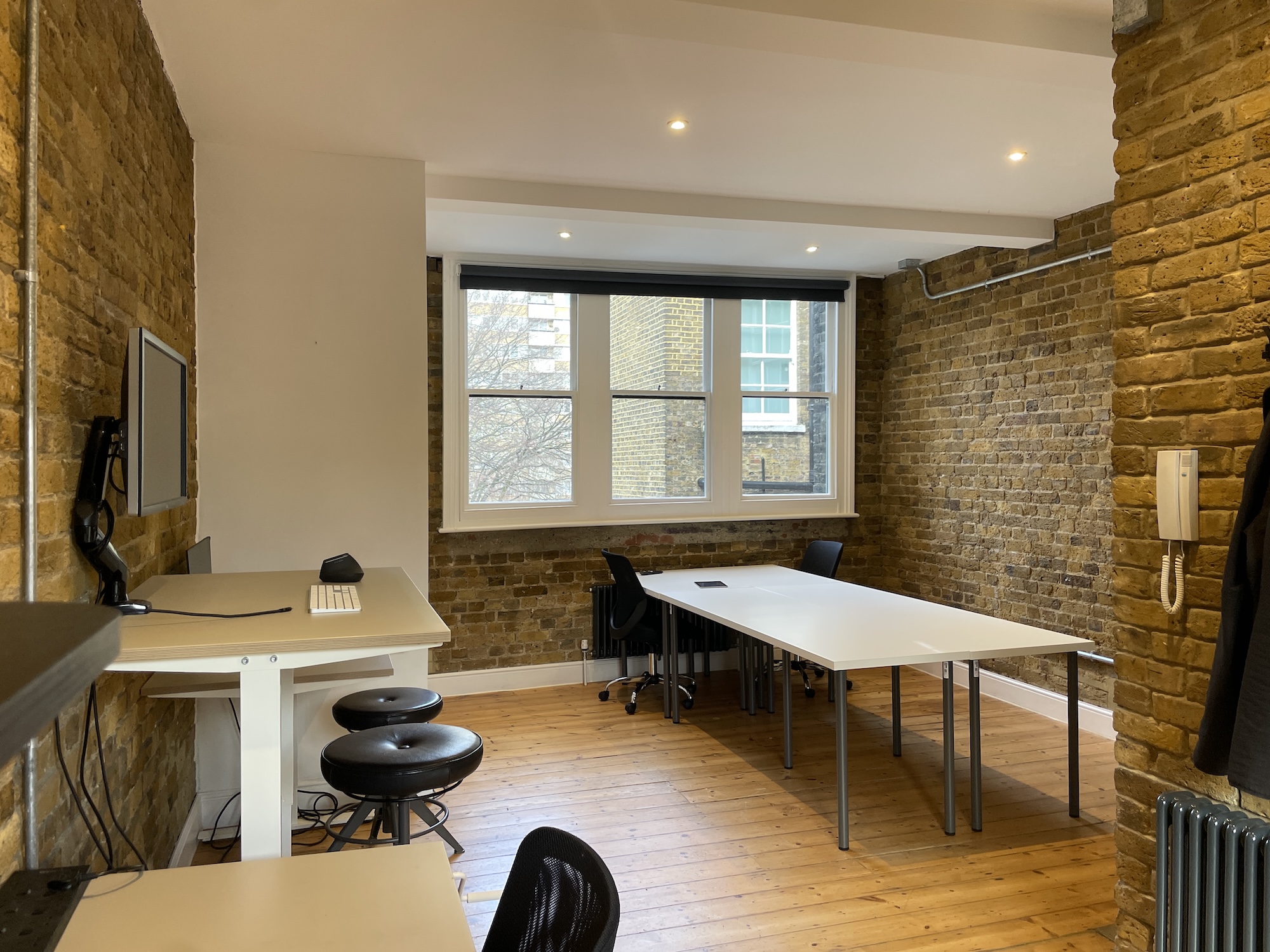 Our self-contained 2-floor penthouse office with roof terrace, two private meeting rooms (10 & 4p), phone booth, seperate 10 person / exec office on upper floor. Dual aspect windows, private kitchen & break-out space.